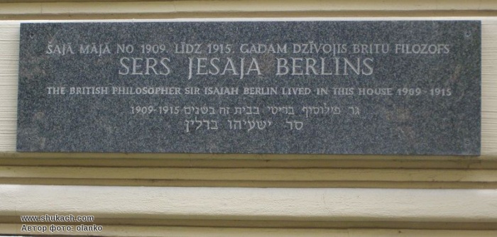 Встановлена на честь видатного філософа ХХ століття Ісайї Берліна, дитячі роки якого пройшли в цьому будинку. Гранітна плита. Текст івритом, латиською і англійською мовами.