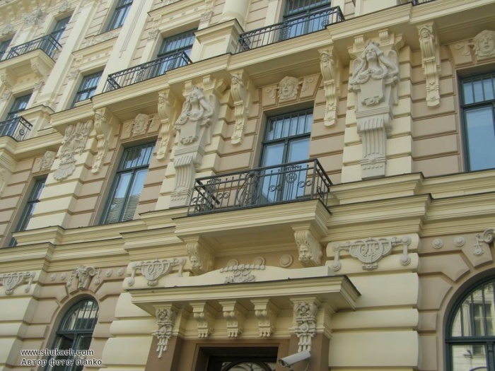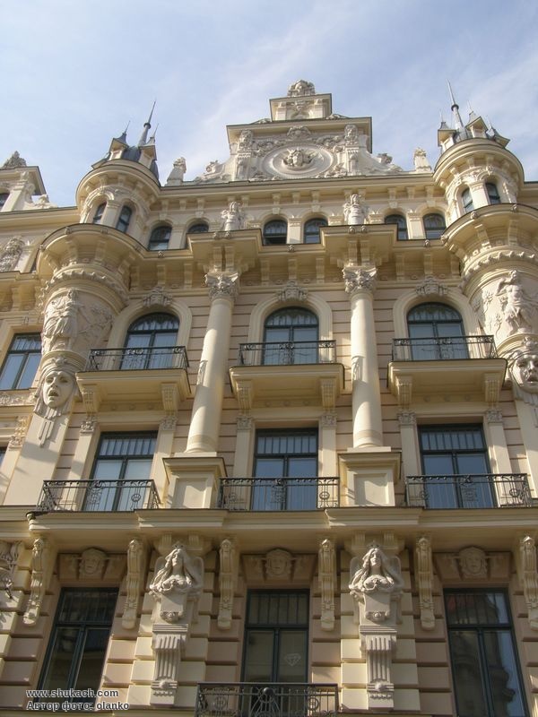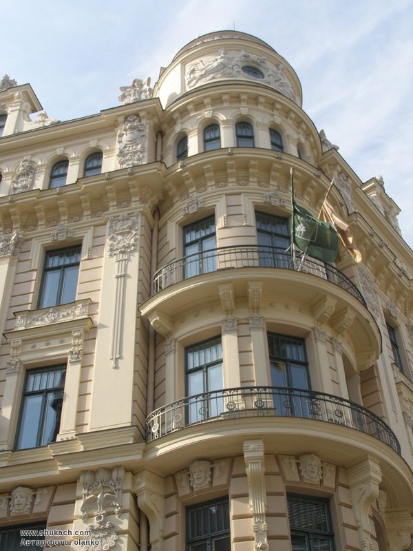 Роти двох величезних масок на фасаді Альберт-стріт також залишалися напіввідкритими від крику. Поверх них створюються об'єми у вигляді перевернутого конуса, які підтримують еркери в підлогу, візуально обрамляють центральний коник та домінують над усією фасадною конструкцією. Різноманітні символічні мотиви вплетені майже у кожен із незліченних декоративних візерунків. Тут і загальний символ пишноти модерну, павич з розпущеним хвостом, і голови лицарів, які дбають про те, щоб жіноча краса охоронялася належним чином, а також змії, що переплітаються в композиції з квітів та геометричних фігур, що відповідають візерунку. Вигнуті натягнуті лінії модерну – символ уваги та хитрості, а також низка різноманітних прикрас. Металеві поручні балконів також виконані в типовому для стилю модерн візерунку ліній. У 1998 році будинок був куплений Фондом Сороса і переданий в дар Ризькій юридичній школі, для потреб якої він був перебудований з 1999 по 2002 рік.