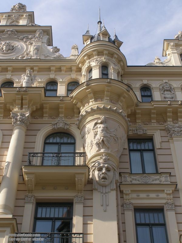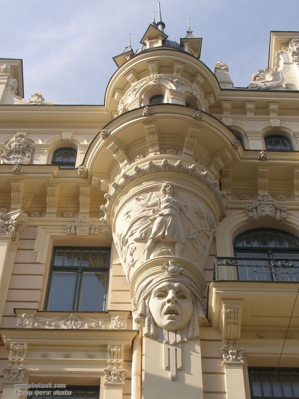 Центральна маска з сяючою діадемою – символ свободи, сонця чи перемоги. Оздоблення фасадів також багато відображає образ жінки, особливо поширений у ризькому модерні. Це видно як у скульптурах на повний зріст над аттичним карнизом, у кількох великих і малих масках, у погруддях над головним карнизом, так і в пафосному виступі в кутовому вінці будівлі. У одних представниць прекрасної статі обличчя мрійливі, в інших царствений сміх, у третіх відкриті роти та стиснуті руки у крику жаху.