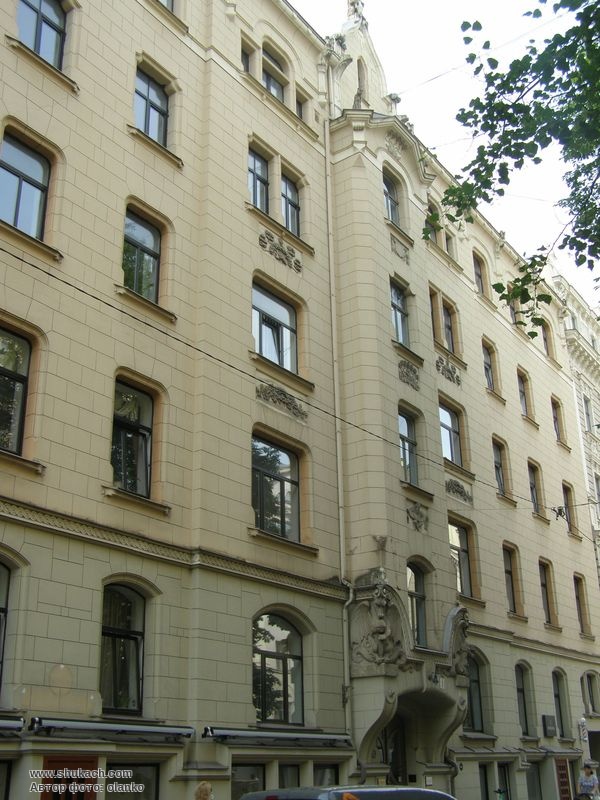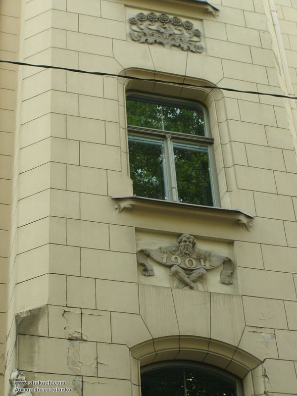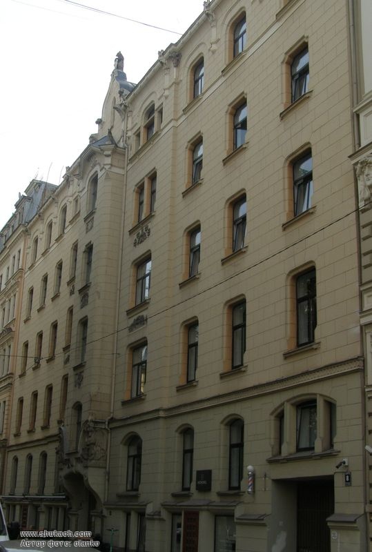 П’ятиповерховий прибутковий будинок з цокольним поверхом зведений у 1904 році за проектом архітектора Константина Пешкенса на замовлення Ладзіня. Югендстиль. На еркері два крилаті дракони, їхні лапи складені так, щоб вони могли тримати прапори. Над ними зображений чоловічок, який сидить на стільці і тримає в руках довгий рушник з датою «1904». На самому верху будівлі – ведмідь, а під ним сонце, що спрямовує вниз свої промені. Трохи нижче на еркері сидять і дивляться вниз дві пантери. Між ними зображені квіти маку, які змієподібно звиваються, - один з популярних мотивів епохи модерну, символ мрій і сп'яніння.