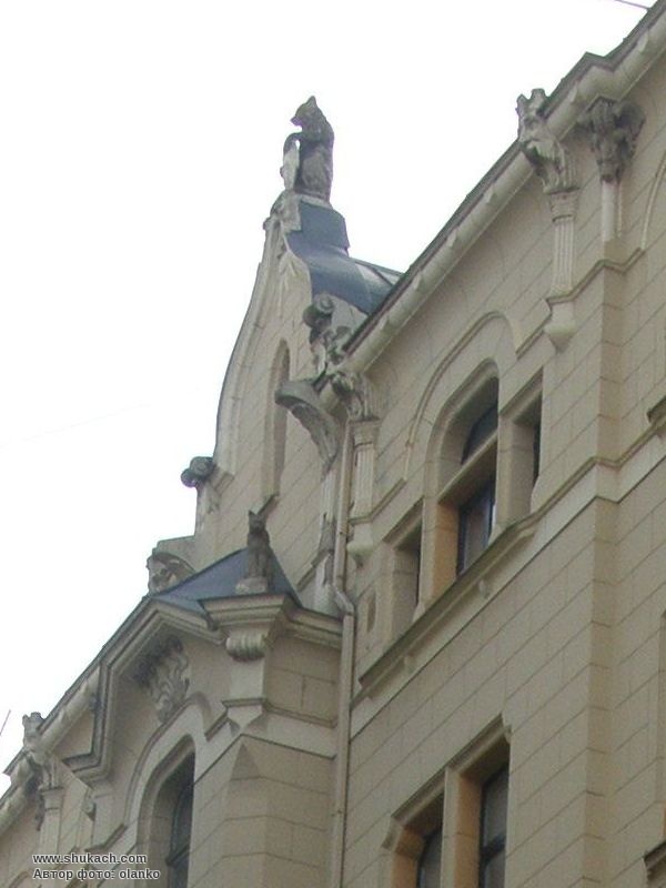 Елегантний фасад будівлі у стилі модерн відрізняється вражаючим вхідним акцентом із крилатими драконами під еркером. Зміщені на півповерху віконні отвори відбивають внутрішню просторову структуру будівлі: в еркері розташовані сходові майданчики. До асортименту стриманих скульптурних прикрас також входять стилізації різних інших живих істот та рослинних мотивів. Пам’ятка архітектури.