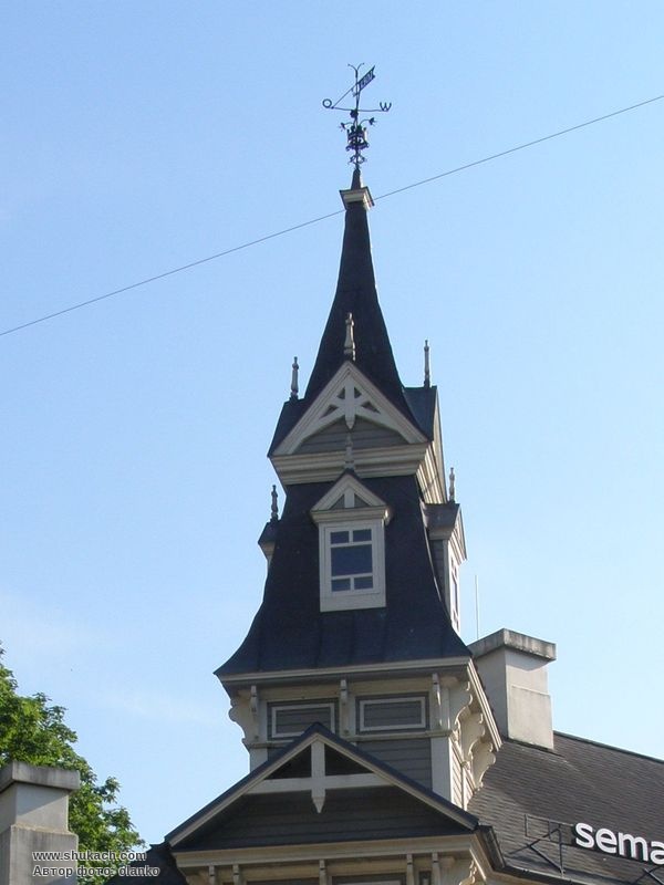 Двоповерховий дерев’яний житловий будинок з крамницею на першому поверсі зведений у 1907 році. Наріжжя прикрашене прямокутним еркером, який завершується декоративною вежкою з флюгером, на якому є дата завершення будівництва. Пам’ятка архітектури.