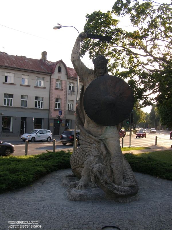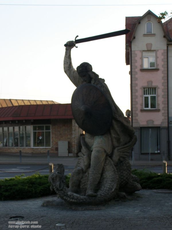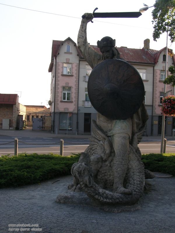 У 1950 році на замовлення Грузії Латвія виготовила цю скульптуру на честь Георгія Переможця. У Грузії цей джентльмен є національним героєм (він навіть зображений на гербі штату Джорджія), а його ще в народі називали Святим Георгієм. Однак, коли скульптура була готова, Грузія несподівано відмовилася від замовлення. Тому скульптура була нікому не потрібна. Для того, щоб вона не стала непридатною, автор скульптури подумав, що якщо він «зробить» для цієї скульптури великий капелюх і вкладе в руки меч (трохи змінивши положення руки), то вона бути схожою на латиського національного героя Лачплесіса. На жаль, «перетворення» не вийшло ідеально.