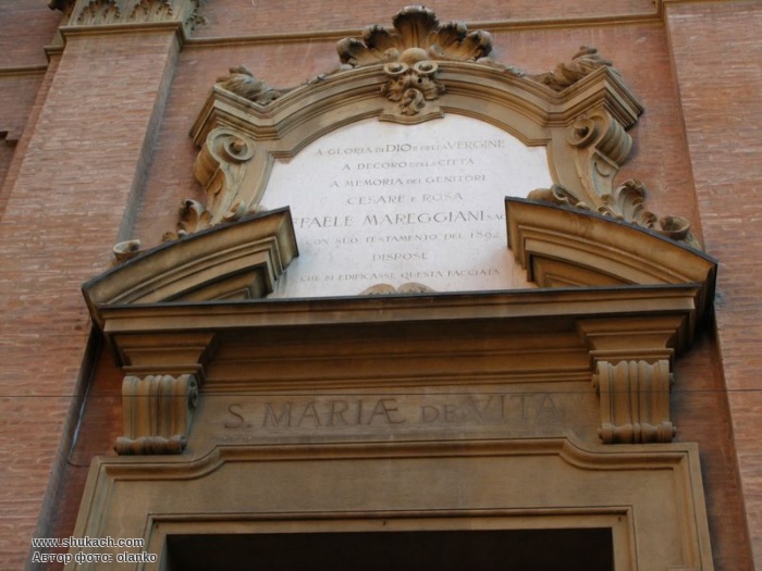 Текст: «На славу Бога та Богородиці в окрасі міста на пам'ять батьків Чезаре та Рози Раффаеле Мареджані, священик, своїм заповітом 1892 року наказав збудувати цей фасад».