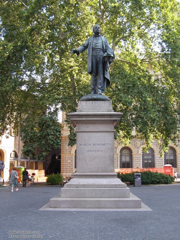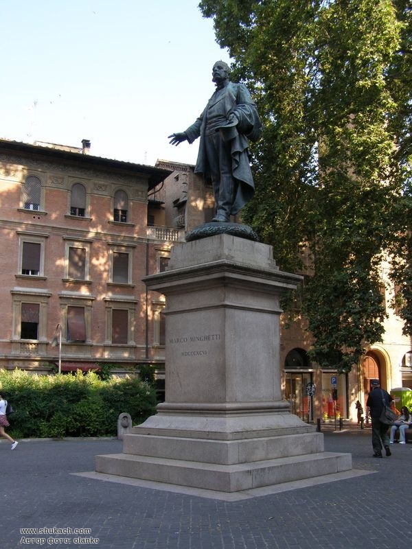 Пам'ятник Марко Мінґетті у Болоньї стоїть на невеликій та красивій однойменній площі в центрі міста. Марко Мінґетті народився (1818 р.) і виріс у Болоньї, де прославився як журналіст. Пізніше його було обрано депутатом Римської ради і незабаром він став міністром. Коли почалася боротьба за незалежність, він приєднався до армії П'ємонту як солдат. Після закінчення війни Марко був прийнятий до кабінету міністрів Камілло Бенсо ді Кавура в 1859 році. Пізніше він був міністром різних відомств у різних кабінетах і навіть якийсь час очолював уряд. Найбільших успіхів політик досяг на посаді міністра фінансів – уперше не було дефіциту державного бюджету. Марко також був відомим письменником і одним із найкращих ораторів свого часу. Він помер у Римі у 1886 році.