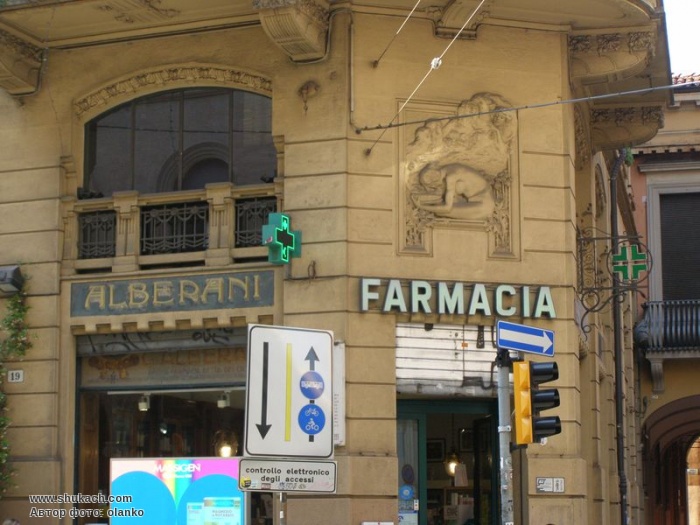 Також у цій конструкції вибір планіметричної системи виявляє намір комерційно використовувати кутове рішення, а «знаки» представницьких амбіцій розташовані на наріжжі (горищна скульптурна композиція, що містить дату будівництва та прикрашена двома путті, що схиляються на колінах під крилами орла) та емблеми підприємницької діяльності (барельєф жіночої фігури, розміщений на рівні аптеки та символізує науку). На фасаді (крім двох скульптурних вставок, за моделлю Альфонсо Боргесані) численні декорації із квітковим присмаком (мансардна планка, віконні рами та вінці, перила та орнаменти під балконами).