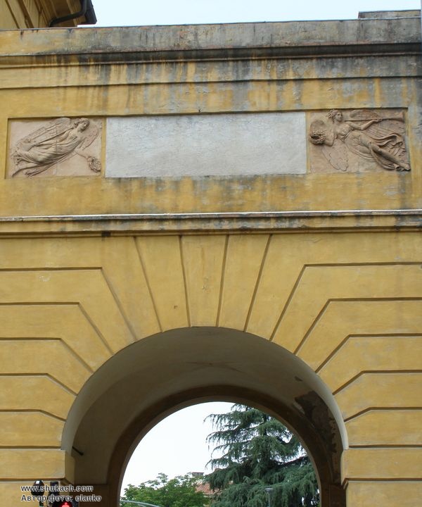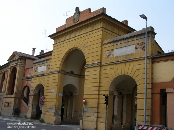 Центральна арка для проїзду транспорту і дві по боках для проходу пішоходів. Центральну арку прикрашає скульптурна голова лева і герб Болоньї. Над бічними арками – барельєфи із зображенням ангелів.