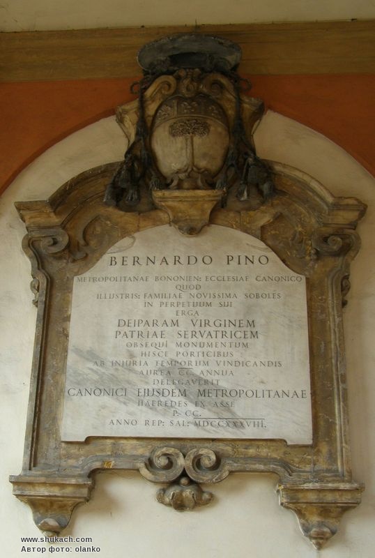 Текст: «Бернардо Піно, каноніку Болонської митрополичої церкви, тому що він, останній нащадок дуже відомої родини, як вічний пам’ятник його поваги до Діви Дейпари, рятівниці Вітчизни, щоб спокутувати ці портики від спустошення часу, він призначив 200 золотих на рік. Канони того ж митрополита, спадкоємців по осі заповіту, поміщені в рік викупу 1738».