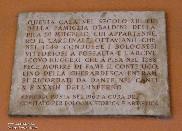 Текст: «Цей будинок у тринадцятому столітті належав родині Убальдіні зі палі Муджелло, до якої належав кардинал Оттавіано, який у 1249 році привів переможних болонців у Фоссальту, і архієпископ Руджері, який у Пізі в 1288 році уморив голодом графа Уголіно делла Герардеска. Обидва згадуються Данте в піснях X і XXXIII про пекло».