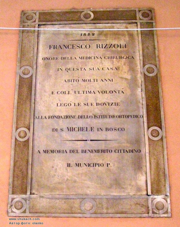 Встановлена у 1882 році на честь видатного лікаря, одного з засновників сучасної ортопедії Франческо Ріццолі. Він жив в цьому будинку багато років.