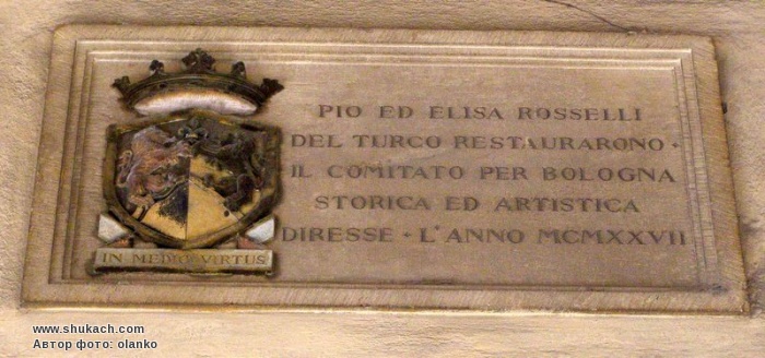 Дошка з гербом шляхетної родини на честь Піо і Елізи Росселлі дель Турко, які своїм коштом провели реставрацію палаццо. Встановлена у 1927 році комітетом Болоньї з історії і мистецтва.