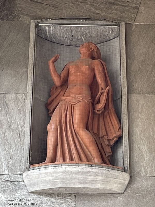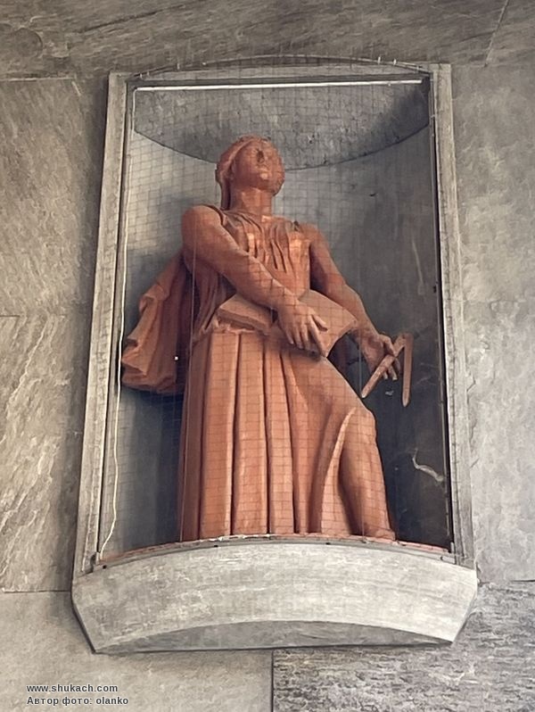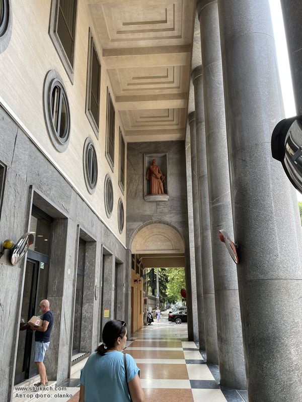 Явний сценографічний смак та майстерне поєднання мармурових покриттів породжують композицію, типову для монументалізму доби фашистського режиму. Скульптури в бічних нішах портика, що символізують Науку і Мистецтво, виконані рукою Ерколі Дреї. З первісного проекту було побудовано лише блок праворуч; фактично, також передбачалося розширення іншої частини будівлі у тому самому стилі з п'ятьма високими колонами ліворуч від існуючого фасаду.