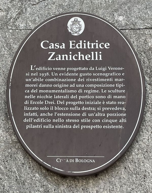 Будівля зведена у 1938 році за проектом архітектора Луїджі Веронезі для розміщення штаб-квартири видавництва Zanichelli, яке було засновано у 1859 році моденським книготорговцем Нікола Занічеллі. Це одна з небагатьох болонських будівель, облицьованих мармуром та гранітом. Будівництво фінансував Ісайя Леві, багатий туринський єврейський бізнесмен. Він вклав у видавництво солідний капітал, ставши його найбільшим акціонером і таким чином врятував його від банкрутства.