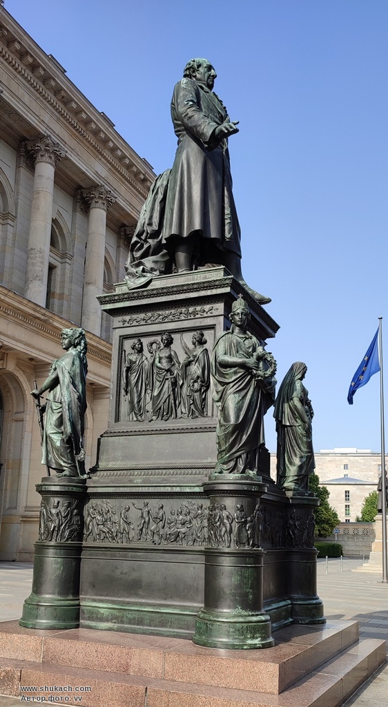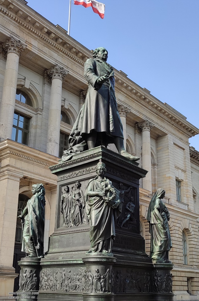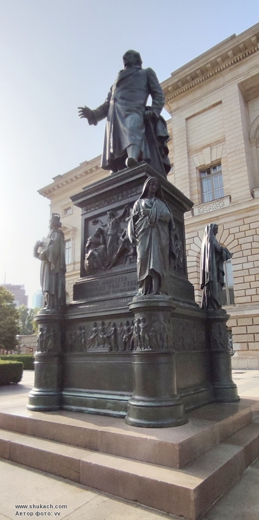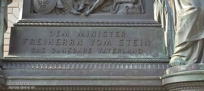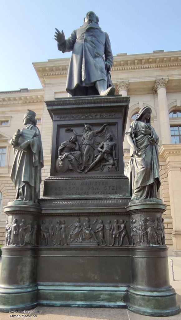 Пам'ятник був створений у 1864-1869 роках Германом Шівельбайном і Гуго Хагеном у стилі реалізму. На ньому напис «DEM MINISTER / BARON VOM STEIN / THE GRATEFUL PATHERLAND». На головній фігурі заввишки 3,30 метра зображений прусський державний діяч і реформатор Карл Фрайхер фон Штайн , що йде попереду колони. На сюртуку він носить орден Чорного орла . Лівою рукою він спирається на палицю, правою вітається з глядачем. Другорядні фігури на підставі заввишки 4,50 метрів представляють чесноти Штейна: благочестя , правду , силу волі та патріотизм .представляти; між рельєфами — алегорії надії , самопожертви , повстання народу та перемоги .Фриз нижче показує заслуги Штайна в реформуванні прусської держави та звільненні від наполеонівського іноземного панування; з боків запровадження державного міністерства , заснування ландверу , вступ до Лейпцига та відкриття ландтагу ; Бронзова скульптура висотою 7,80 метрівє одним із шедеврів берлінської школи скульптури . Протягом історії пам'ятник кілька разів змінював своє розташування. пам'ятник стоїть з 2003 року ліворуч перед будинком резиденції Берлінської палати представників .