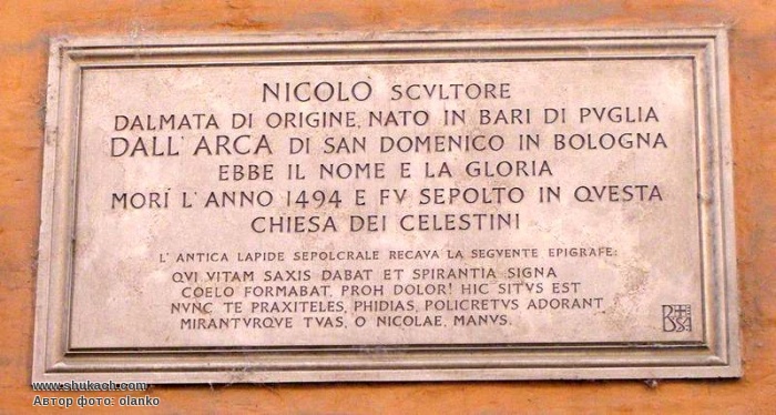 Встановлена на честь відомого скульптора (дослівно на дошці: «мав ім’я і славу») Ніколо дель Арка, який працював в Болоньї, помер у 1494 році і похований в цій церкві. Найбільш відома його робота – гробниця святого Домініка, який похований в Болоньї у базиліці (зрозуміло) святого Домініка, а також група теракотових скульптур «Оплакування Христа».