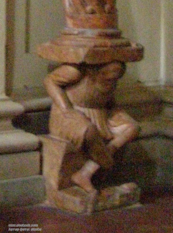 Кручена колона з капітеллю коринфського ордеру з веронезького мармуру, підтримувана невеликою фігурою атланта, походить від мармурових дверей з південного боку храму під назвою Porta dei Leoni, розпочатих в 1220 році, імовірно, маестро Вентура, за велінням єпископа Енріко делла Фратта.