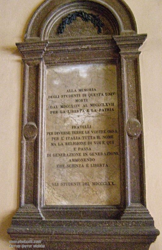 Мармурова дошка в кам’яній рамі встановлена на честь студентів Болонського університету, які загинули за свободу і незалежність Італії з 1794 по 1867 рік. Дошка встановлена у 1870 році на кошти студентів університету у фойє палацу Поджі, де зараз розміщується ректорат закладу.