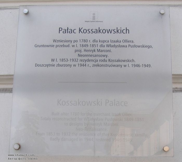 У 1853 році палац став власністю графині Олександри Коссаківської, уродженої Лаваль. Її чоловік, Станіслав Щенсни Коссаківський, збирав у будинку колекції картин і зброї; він також створив велику бібліотеку. У 1858 році інтер'єр палацу було перебудовано за проектом Францішека Марії Ланці.