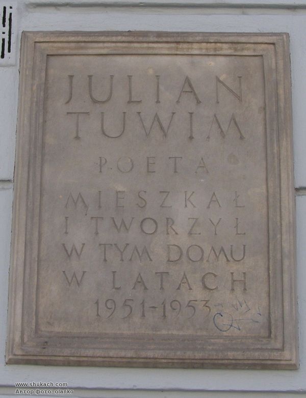 Дошка з піщанику свідчить, що у цьому будинку у 1951-1953 роках жив і працював видатний польський поет Юліан Тувім.