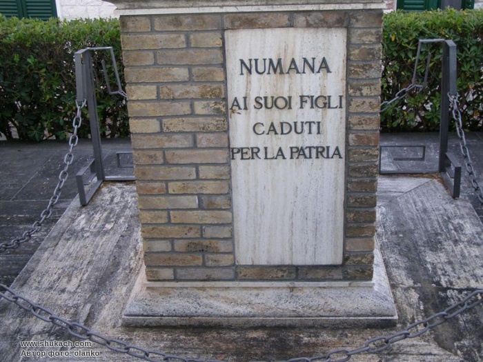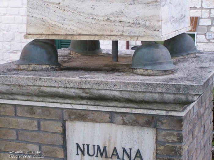Обеліск з травертину спирається на чотири бронзові каски. На постаменті надпис «Нумана – своїм дітям, що пали на Батьківщину».