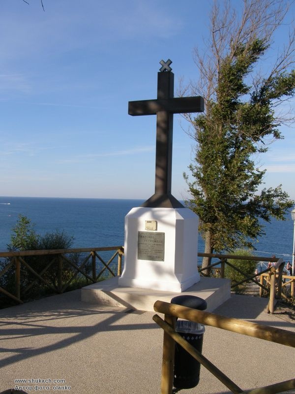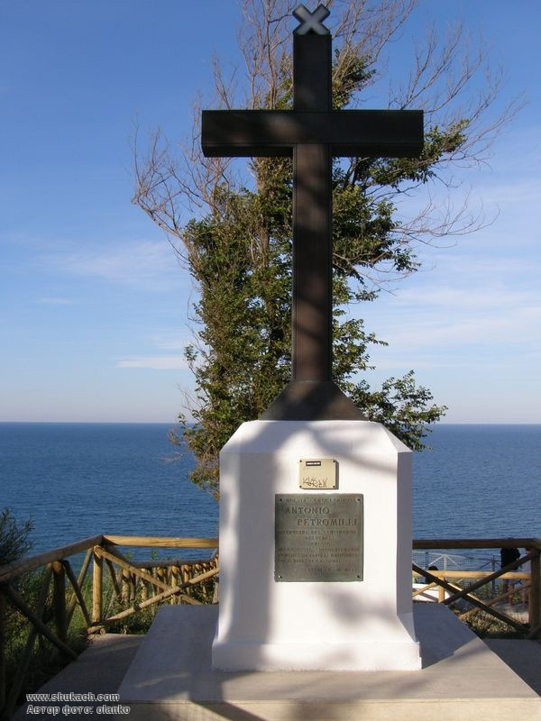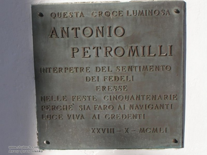 Встановлений на краю скелі над морем. Текст на табличці: «Цей світлий хрест Антоніо Петроміллі встановлений у п’ятдесяту річницю, щоб бути маяком для моряків, живим світлом для віруючих». Урочисто відкритий 28 жовтня 1951 року.