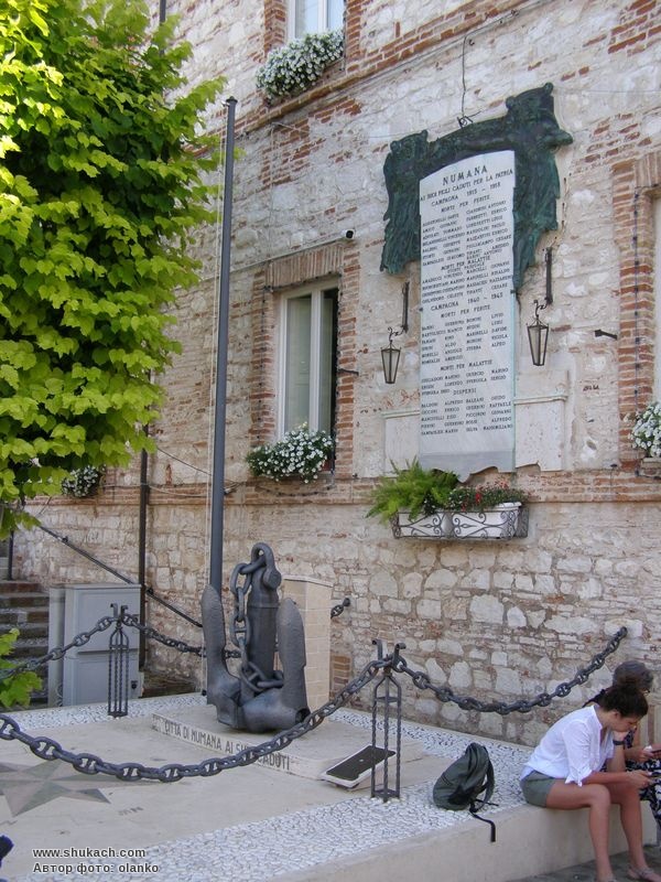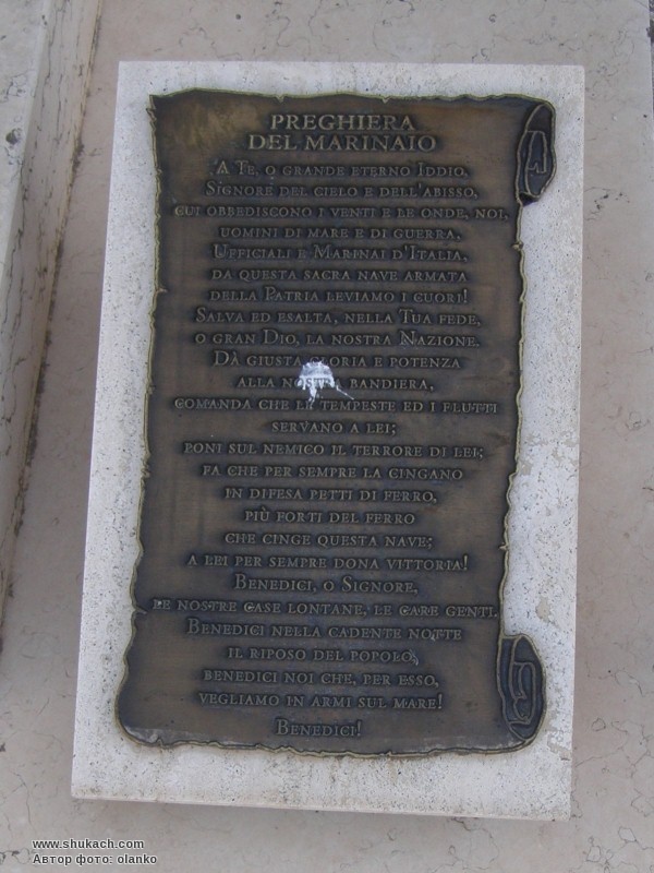 Пам'ятник полеглим у першу та другу світові війни жителям міста. Він складається з піднятої на 15 см прямокутної підлоги. Два артилерійські снаряди розташовані біля передніх вершин тротуару. На задніх вершинах є дві маленькі металеві опори. Ці конструкції підтримують великий ланцюг, що обмежує периметр основи. У центрі бруківки — поліхромна мармурова композиція у формі троянди вітрів. Над тротуаром знаходиться ще одна невелика прямокутна мармурова основа, на якій стоїть якір із написом спереду. З правого боку постаменту є флагшток. З лівого боку основи знаходиться табличка, на якій вигравіровано молитву матроса.