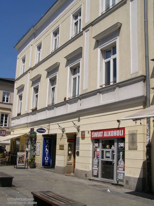 Дошка встановлена на будинку, де він жив в часи німецької окупації. Текст польською і англійською мовами.