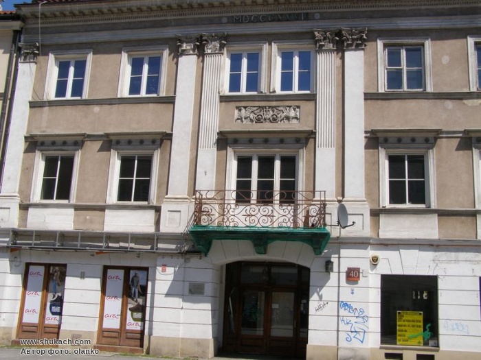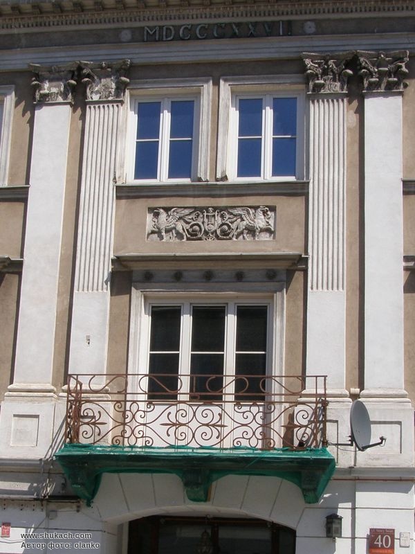Фасад прикрашають пілястри з капітелями коринфського ордеру, пласкі і профільовані. По центру – вставка зі скульптурним зображенням двох грифонів. Дані, вказані на мармуровій табличці на фасаді будинку не співпадають з архівними даними про будівництво і відновлення.