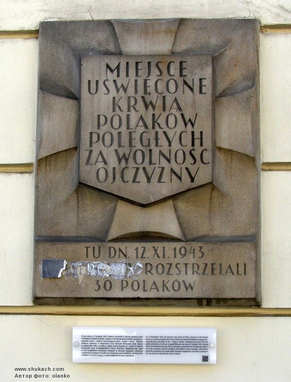Текст: «Місце, освячене кров’ю поляків, які полягли за свободу Батьківщини. Тут 12 листопада 1943 року нацисти розстріляли 30 поляків».