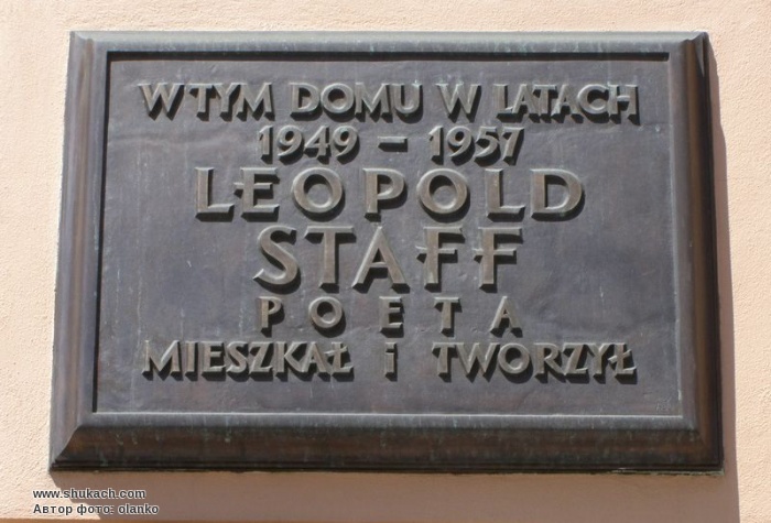 Бронзова дошка на перетині вулиць Нови Свят і Ординацької. У цьому будинку в 1949 - 1957 роках жив і творив поет Леопольд Стафф.