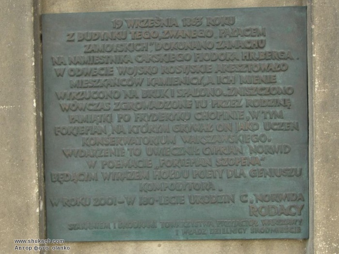 Встановлена на честь польського письменника, поета, художника і скульптора Ціпріана Каміля Норвіда. Серед його творів – вірш «Фортепіано Шопена», про інструмент композитора, який російські військові у 1863 році викинули з вікна саме цього палацу. На фасаді палацу у 2001 році до 180-річчя з народження поета встановлена бронзова дошка з погруддям Норвіда.