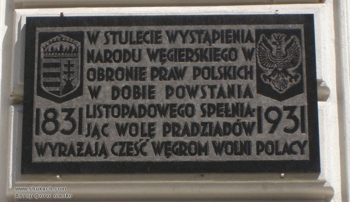 У 1831 році дії польських повстанців підтримали угорці, які в дев'ятнадцятому столітті також боролися за свою незалежність. У сторіччя цієї події в 1931 році було відкрито пам'ятну дошку на стіні палацу Сташица. Текст: «На сторіччя дій угорської нації на захист польських прав в часи Листопадового повстання, виконуючи волю своїх прадідів, вільні поляки висловлюють свою честь угорцям». На табличці також зображені герби Угорщини та Польщі.