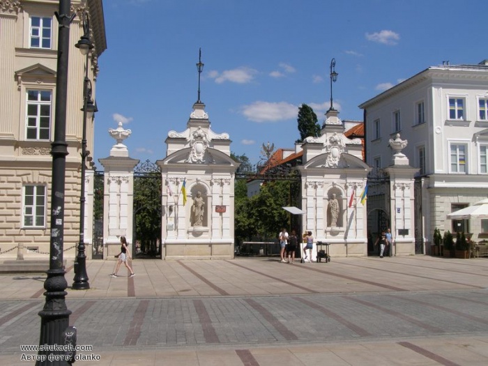 У нішах воріт розміщені фігури Уранії, що символізує знання, і Афіни, що символізує мир. Їх спроектував Зигмунт Лангман за зразком старовинних оригіналів у музеях Ватикану. Статуї були сильно пошкоджені під час Варшавського повстання і вивезені відразу після війни. Вони повернулися на своє місце після реконструкції 1982 року.