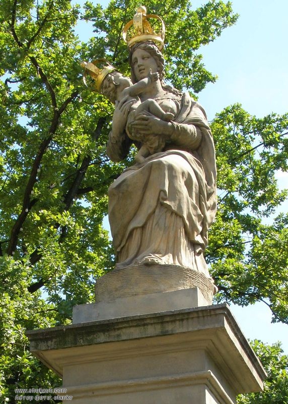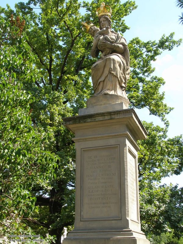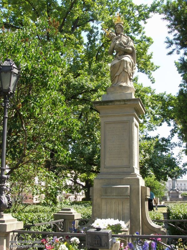 Статуя стоїть на постаменті з пісковика. На чотирьох сторонах постаменту були висічені написи латинською або італійською мовами. Фігура була коронована у 1830-х роках. У 1852 році було здійснено реставрацію на кошти генерала Олександра Гауке «із вдячності за порятунок Республіки Польща в 1852 році, коли лютувала сильна холера», як зазначено в написі на постаменті. Старі цинкові пластини корони, пофарбовані в синій колір, були замінені Гауке залізними позолоченими пластинами. Раніше пам’ятник знаходився в південнішій частині Краківського передмістя (у бік нинішньої площі Міцкевича), у 1866 році його перенесли на сучасне місце.