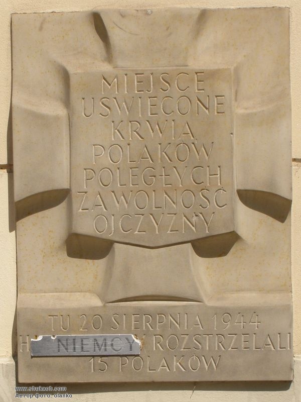 Текст: «Місце, освячене кров’ю поляків, які полягли за свободу Батьківщини. Тут 20 серпня 1944 року нацисти розстріляли 15 поляків».