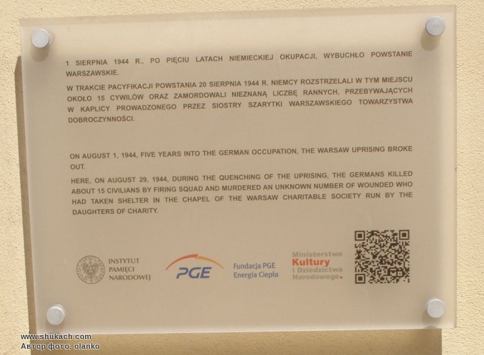 Дошка вшановує жертв німецьких злочинів під час Варшавського повстання. Близько 20 серпня 1944 року німці розстріляли в цьому місці близько 15 польських цивільних, а також вбили невідому кількість поранених, які лежали в каплиці Товариства милосердя сестер милосердя.