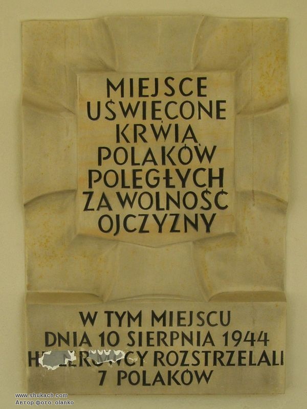 Текст: «Місце, освячене кров’ю поляків, які полягли за свободу Батьківщини. У цьому місці 10 серпня 1944 року нацисти розстріляли 7 поляків».