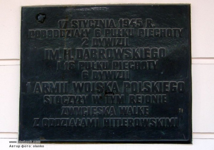 Бронзова дошка нагадує, що 17 січня 1945 року в цьому районі вели бої з гітлерівськими військами за звільнення столиці Польщі підрозділи 6-го піхотного полку 2-ї дивізії ім. Х.Домбровського і 16 піхотного полку 6-ї дивізії 1-ї армії війська Польського.