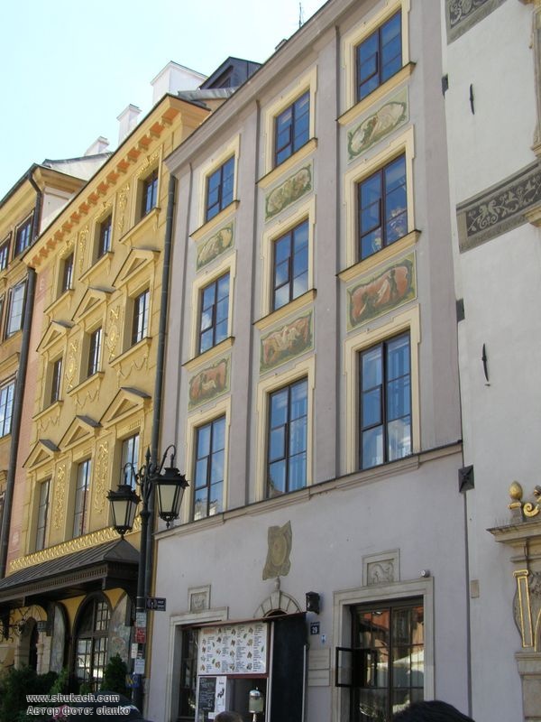 У другій половині п'ятнадцятого століття був побудований триповерховий будинок в готичному стилі, що належав родині патриціїв Казуб. Цей будинок – частково перебудований у 1575-1581 роках – послідовно належав Яну, Якубу та Міколі Гізу. Гізи скасували дерев'яний «домус» і поставили на його місце значну цегляну «лапідею». Будинок мав дев'ять кімнат (з перегородками), два «магазини», два льохи, три кухні і дві багаті палати у дворі.