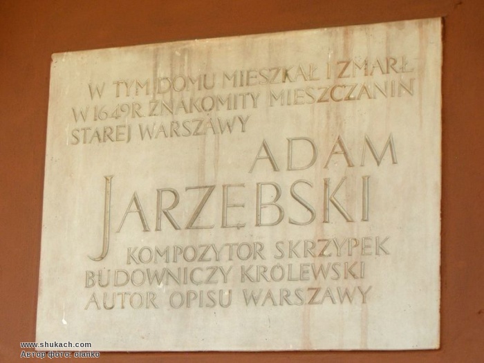 Встановлена на честь композитора епохи бароко, королівського будівничого і поета Адама Яжембського, який жив і у 1649 році помер в цьому будинку. Він був автором першого путівника по Варшаві під назвою «Gościniec або опис Варшави» (1643).