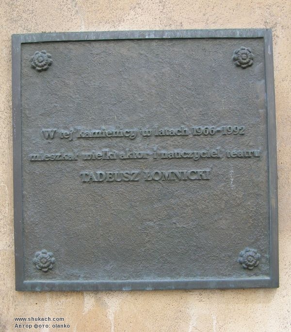 Бронзова дошка встановлена на честь видатного польського актора і педагога Тадеуша Ломницького, який жив у цьому будинку у 1966-1992 роках. Автором дизайну меморіальної дошки є Томаш Куявський з Академії образотворчих мистецтв у Варшаві. Дошка урочисто відкрита 10 жовтня 2012 року.