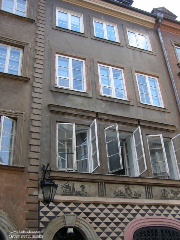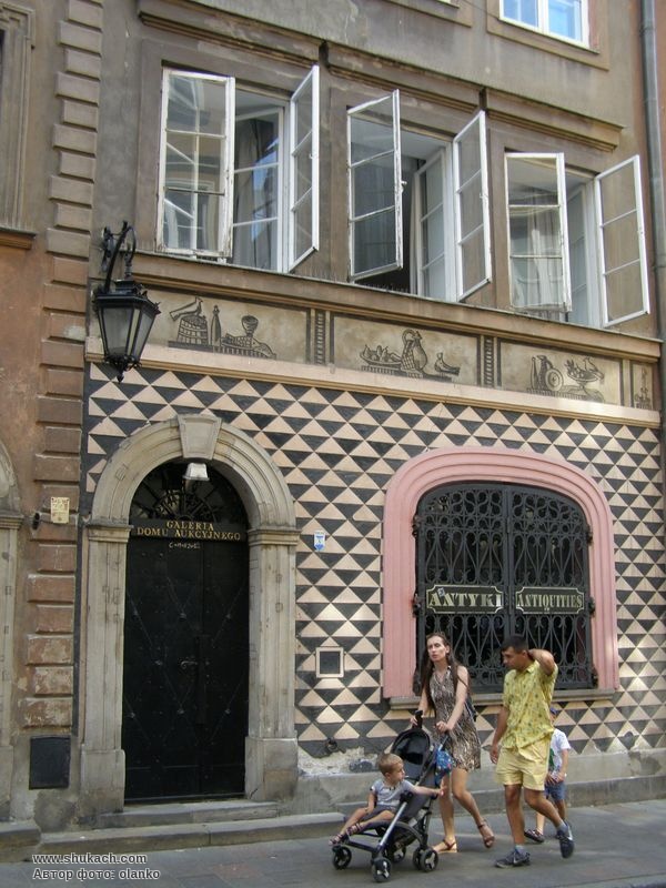 Після зруйнування 1944 р. зберігся фасад до вінцевого карниза. Після знесення (крім підвалів) відбудований у 1949-1955 роках за проектом Єжи Ґаєвського та Влодзімєжа Вапінського, зі зміною декору інтер'єру та фасаду. Чотириповерховий, триярусний (інтер'єр, пов'язаний з прибутковим будинком No 35, перший поверх з частковою реконструкцією старого планування). Тривісний фасад. Зберігся кам'яний портал, частково доповнений, підтягнутий, закритий напівкругло, замковий камінь з літерами J[esus], M[aria], J[ózef] і датований 1744 роком. Поліхром фасаду роботи Гжегожа Вдовицького та Юлії Берлі 1954 року.