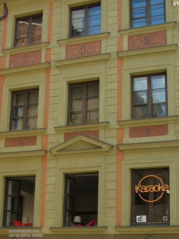 Фасад з боку Широкого Дунаю восьмивісний, з вертикальними панелями між прольотами і смугами кордону. Обидва фасади покриті геометричними і фігурними сграффіто, виконаними у 1954 році Яном Замойським.