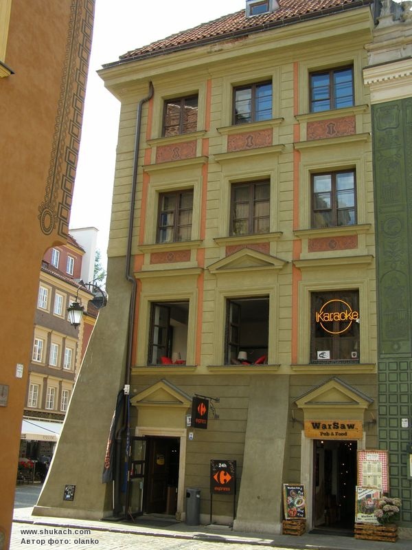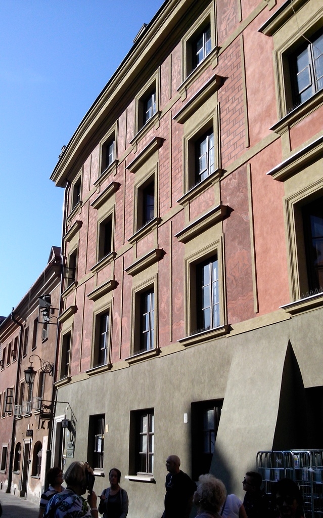 Після руйнування 1944 року збереглися льохи і фасади до вінцевого карниза. Перебудована в 1949-1954 роках за проектом Тадеуша Журовського, зі збереженням фасадів, частково перебудованих з незначними змінами в деталях. Чотириповерхова. У склепінчастих льохах передня і бічна стінки (з боку No 8) готичні, XVI століття. Класицистичні фасади, аналогічно вирішені, підтримуються косими схилами. Тривісний фасад, з рустованим партеровим поверхом. Два прямокутних вхідних отвори увінчані трикутними фронтонами, вікна в профільованих рамах з карнизами.