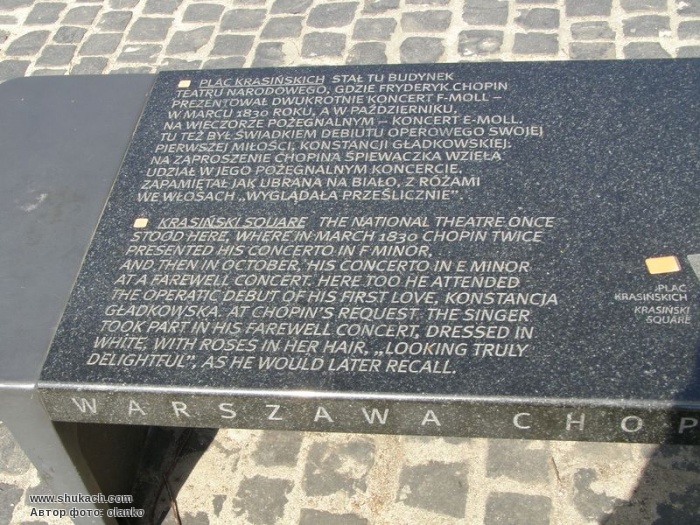 Лавка на площі Красінських встановлена у місці, де стояв Народний театр, в якому Шопен давав концерти у 1830 році.