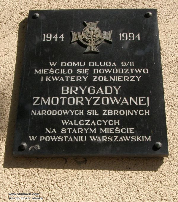В цьому будинку розміщувалось командування і підрозділи моторизованої бригади Національних збройних сил. Бригада приймала участь у боях Варшавського повстання 1944 року у районі Старого міста. Гранітна дошка з бронзовою накладкою встановлена у 1994 році.