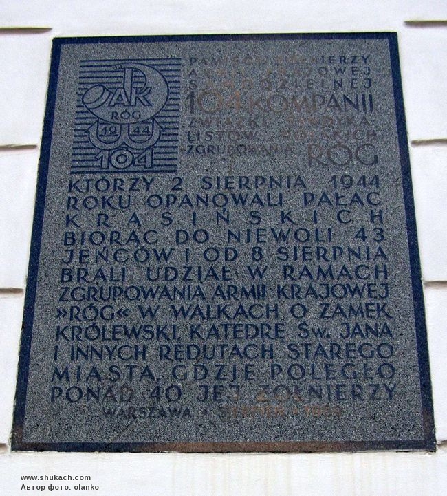 Гранітна дошка на честь загиблих воїнів 104 роти спілки польських синдикалістів групи «Róg», які 2 серпня 1944 року взяли 43 військовополонених, з 8 серпня брали участь в боях за Королівський замок, собор св. Яна і на інших редутах Старого Міста, де полягло понад 40 вояків роти. Дошка встановлена у серпні 1989 року.