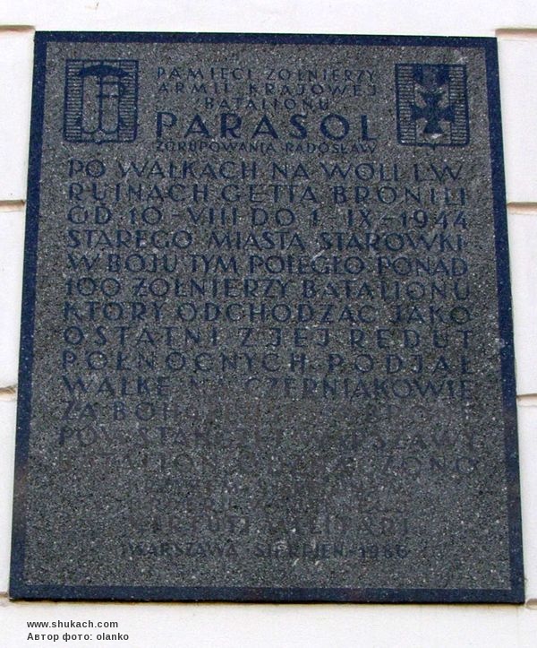 Текст: «Пам'яті бійців АК батальйону «Парасоль» групи «Радослав». Після боїв на Волі та в руїнах гетто вони захищали Старе місто з 10 серпня по 1 вересня 1944 року. Понад 100 бійців батальйону загинули в цих боях». Дошка встановлена у серпні 1986 року.