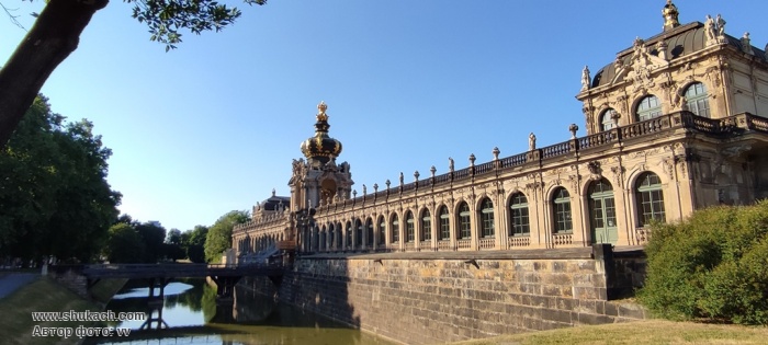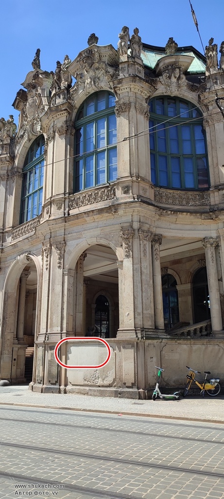 Російські солдати нашкрябали на зовнішній стіні палацу Цвінгер під час Другої світової війни тексти про те, що бомб від авіаудару більше немає. Залишки цього ще видно та відновлюються.