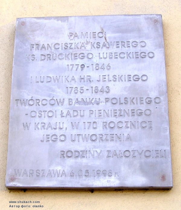 Розташована на фасаді палацу міністра фінансів. Вона вшановує пам'ять князя Францішека Ксаверія Друцького-Любецького (1779-1846) та графа Людвіка Єльського (1785-1843) – творців Банку Польщі, який був основою грошового порядку в Польщі. Дошка була урочисто відкрита 6 травня 1998 року до 170-річчя створення Банку Польщі.